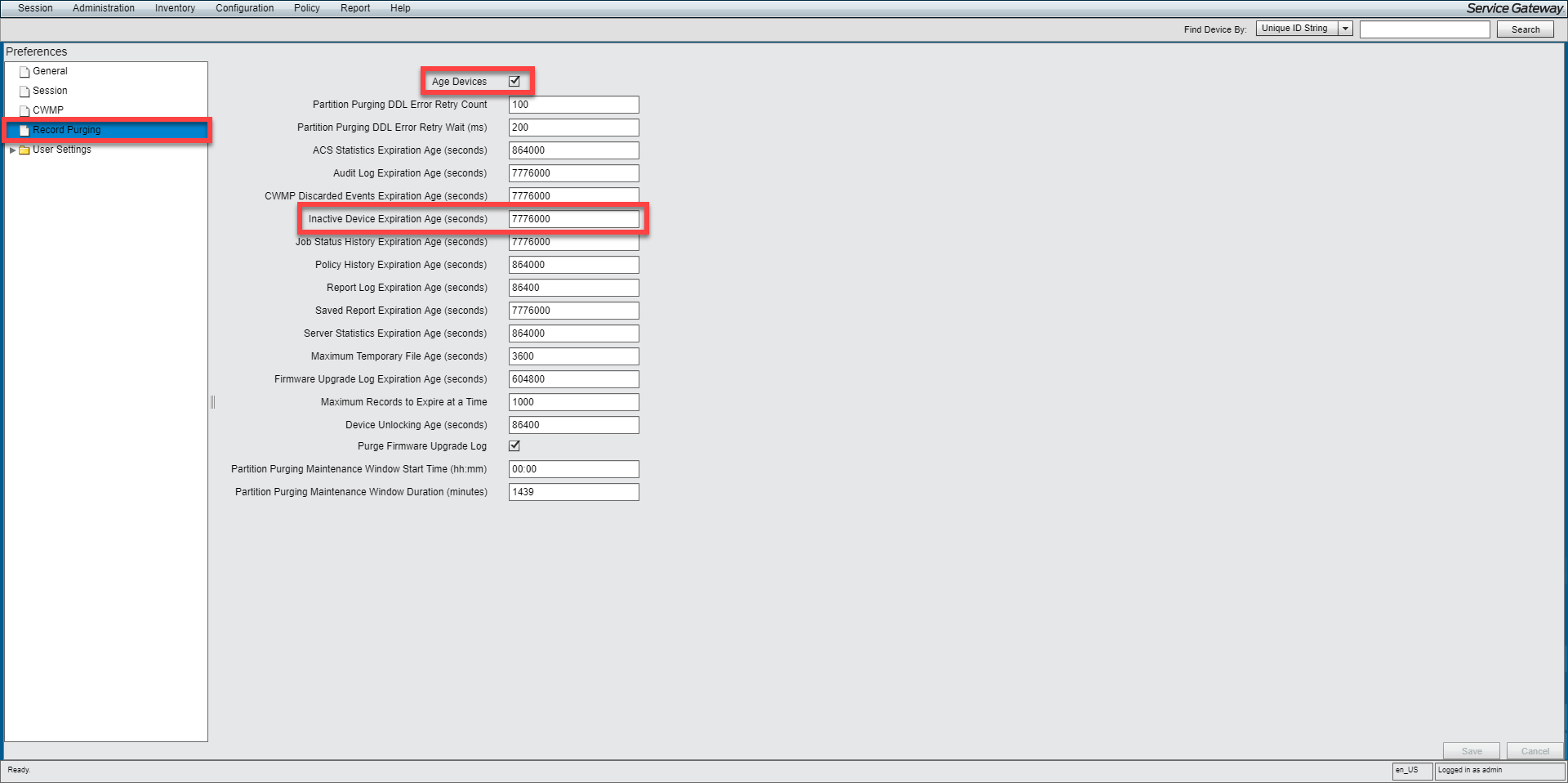 Select Record Purging from the left sidebar and Enable the Age Devices Option.
